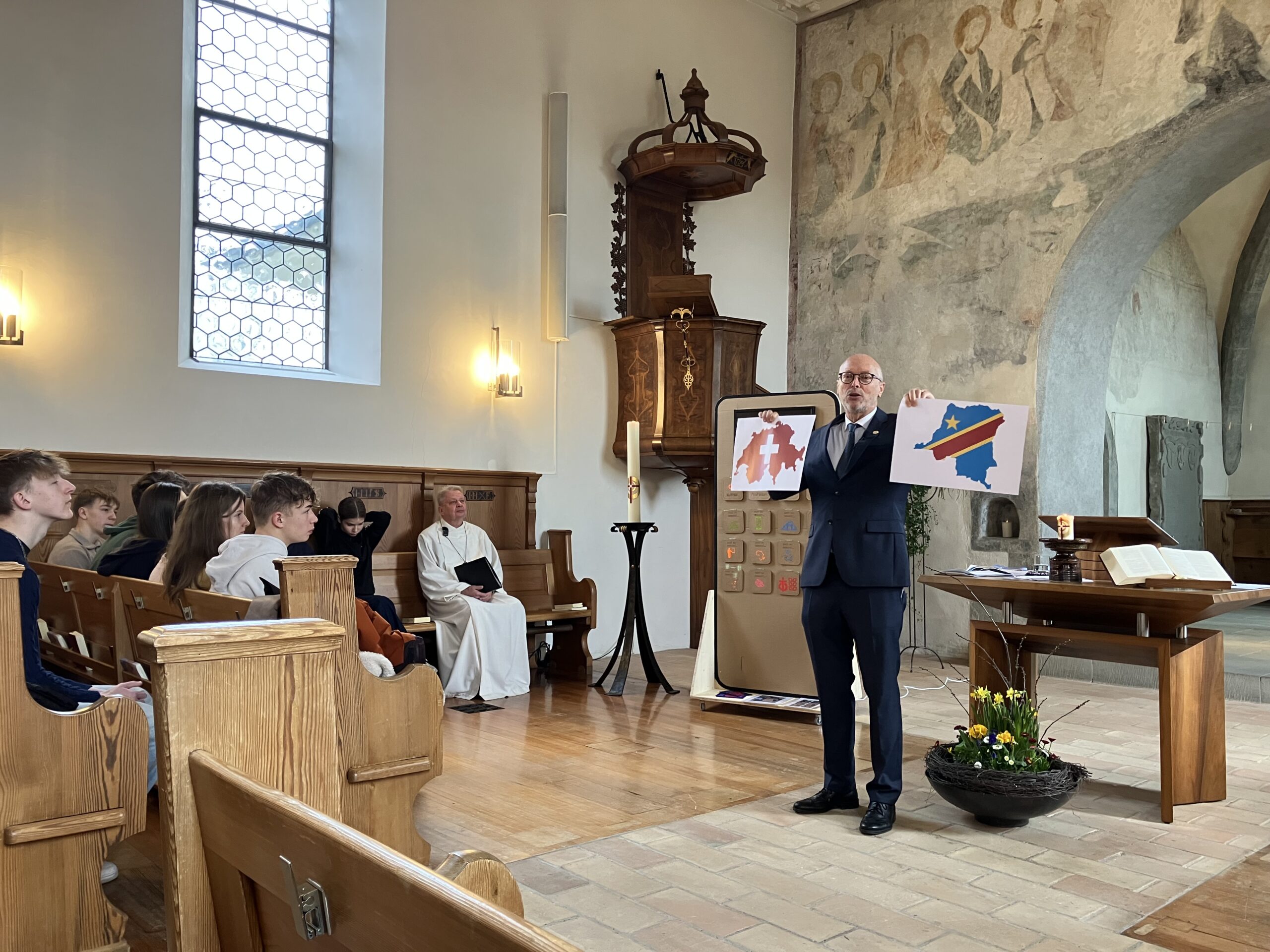 Im Anschluss an die Feier waren alle zum Suppenzmittag ins Kirchgemeindehaus eingeladen. Francois Mercier, Projektverantwortlicher von Fastenaktion, zeigte mit Bildern und seinen persönlichen Erfahrungen, wie wichtig die Unterstützung unseres Projektes in der Demokratischen Republik Kongo ist.